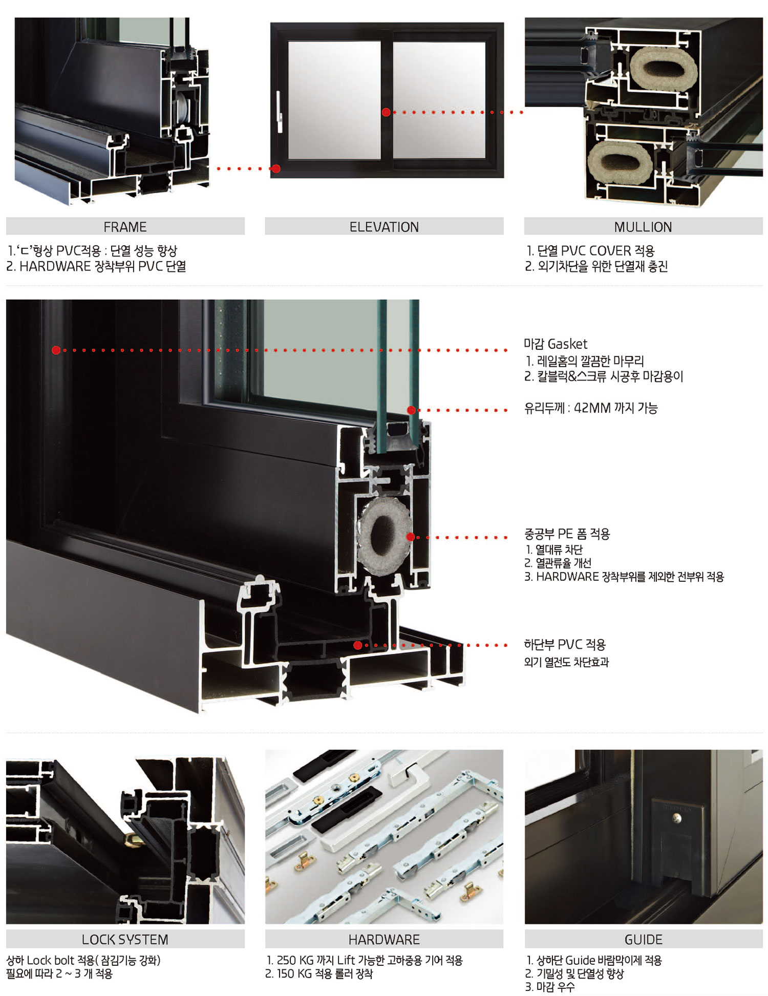최대 150kg의 문짝도 쉽게 작동할 수 있으며, 기어 연동 시스템 방식으로 열릴 때는 문짝이 8mm들어 올려져 부드 럽게 열리고 닫힐 때는 문짝이 프레임의 레일과 완전 밀착 되어 차음과 기밀, 수밀성이 좋은 제품입니다. 독일산 특수 하드웨어를 사용하여 한번의 핸들 작동으로 여러개의 잠금장치가 작동 되어 도난 및 침입의 염려가 없습니다.